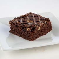A dense chocolate cake with an awesome cocoa flavor, with walnuts and caramel.